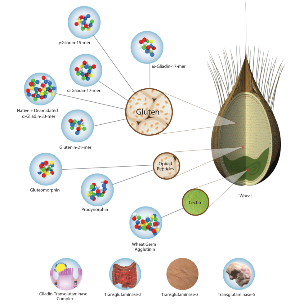 Array 3: Wheat/Gluten Proteome Reactivity and Autoimmunity™ accurately identifies Gluten Reactivity, and measures antibody production against 8 wheat proteins and peptides, 3 essential structure enzymes and the Gliadin-Transglutaminase Complex, a neo-complex which researchers at the 10th International Congress on Autoimmunity in Leipzig Germany (April 2016) presented as the best serological biomarker for intestinal damage and/or Celiac disease.
